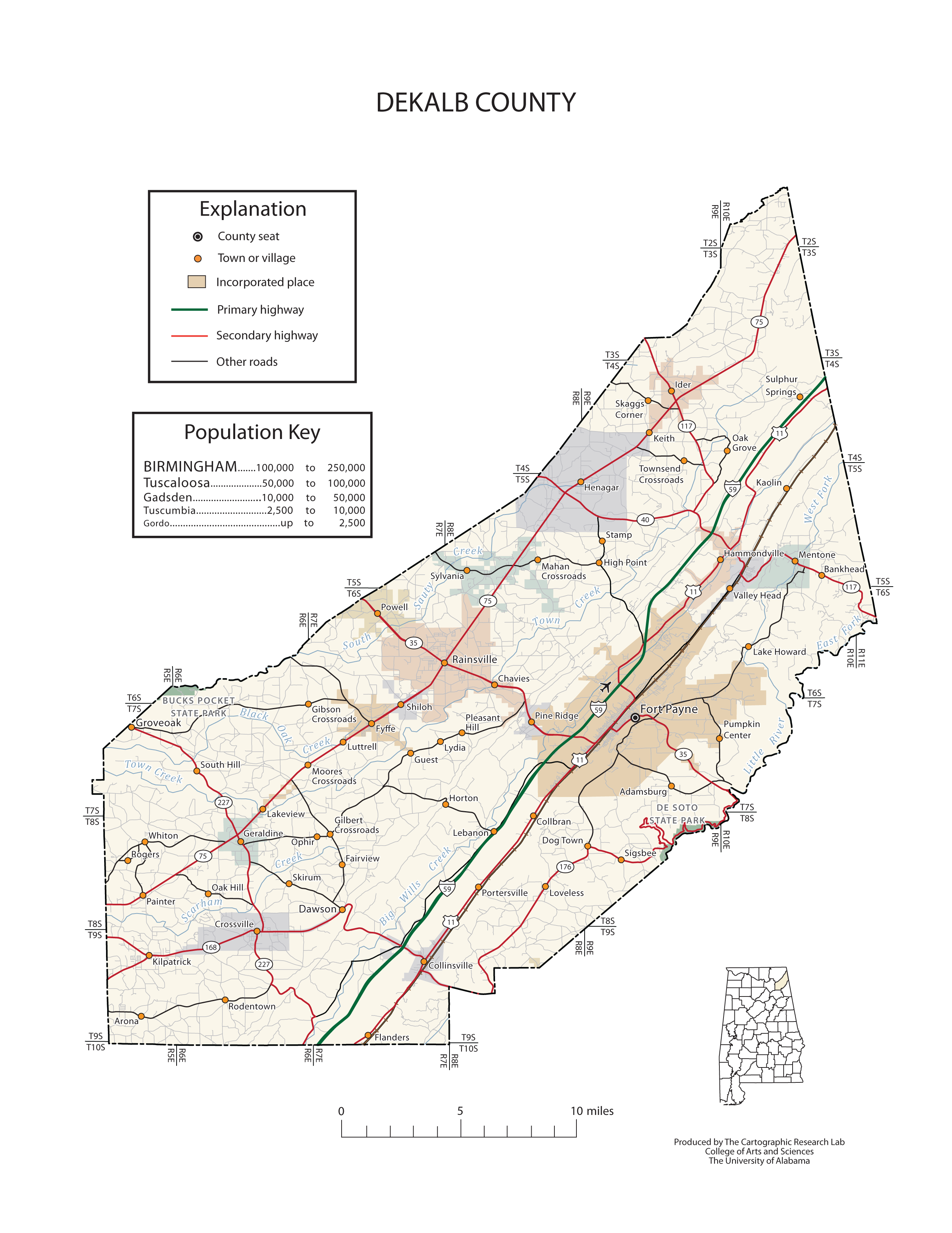 The county is located in the northeast corner of the state and is bordered on the north by Jackson County, on the west by Marshall County, on the south by Etowah and Cherokee Counties, and on the east by the state of Georgia. It currently encompasses 778 square miles with a population of approximate 72,000. The county seat is Fort Payne, which came about in 1878.